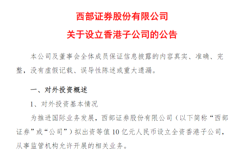 6月12日晚,西部证券官宣称,为推进国际业务发展航心配资,公司拟出资等值10亿元人民币设立全资香港子公司,从事监管机构允许开展的相关业务。